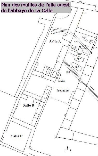 ![]() | Der folgende Raum B, den wir heute „Keller“ nennen, weist die ältesten Mauern des Westflügels der Abtei auf, die bei den Ausgrabungsarbeiten freigelegt wurden. Auf der Seite der Galerie besteht die Mauer des Raumes aus zwei Schichten von Quadersteinen. Der äußere Teil besteht aus einer dünnen Verkleidung, die sich ins 13. Jahrhundert einordnen lässt. Auf der Innenseite konnte durch die Räumung des Saales eine Mauer aus dem 12. Jahrhundert mit vier Öffnungen freigelegt werden. Die Arkadenmauer